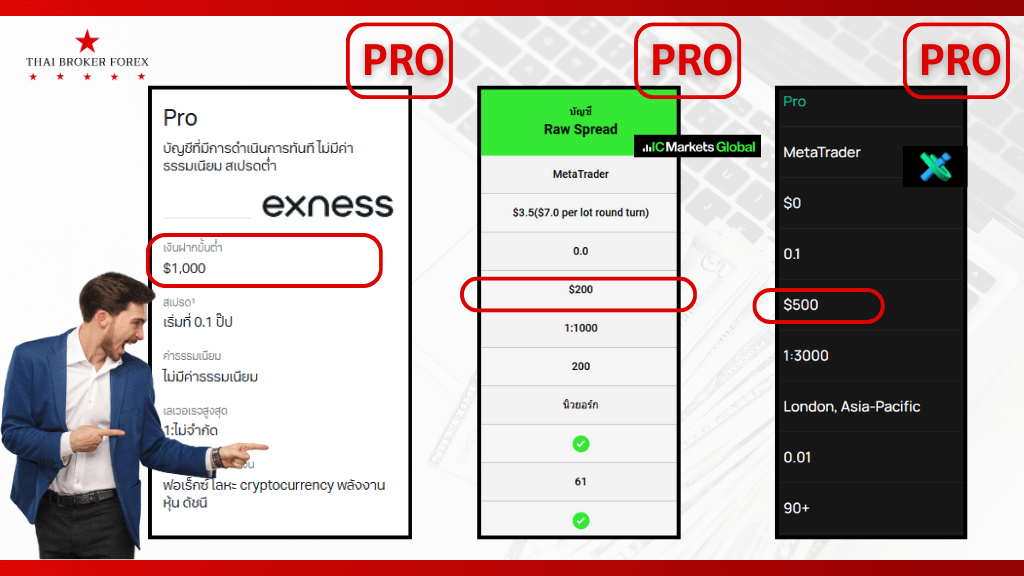 ภาพนี้อธิบายถึงบัญชี Pro ของแต่ละโบรกเกอร์ โดยเริ่มตั้งแต่ $200 หรือ ประมาณ 6,600 บาท โดยมีโบรกเกอร์ Exness ที่ฝากขั้นต่ำที่ 33,000 บาท หรือ $1,000 เหรียญ