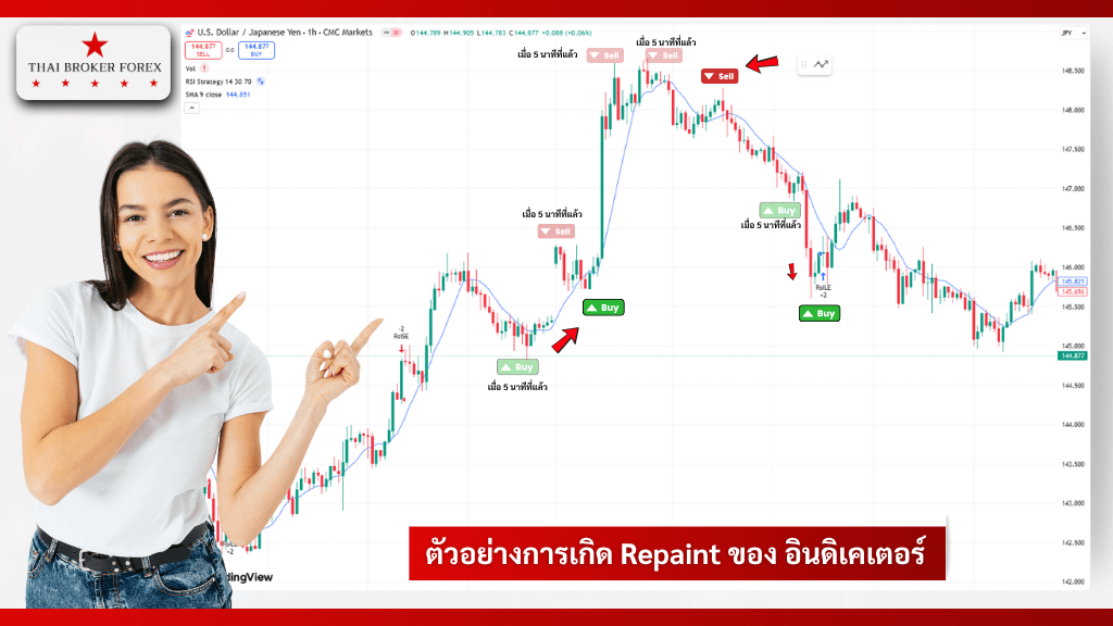 - Repaint หมายถึงพฤติกรรมของอินดิเคเตอร์ที่เปลี่ยนสัญญาณย้อนหลังหลังจาก แท่งเทียน ปัจจุบันจบลง