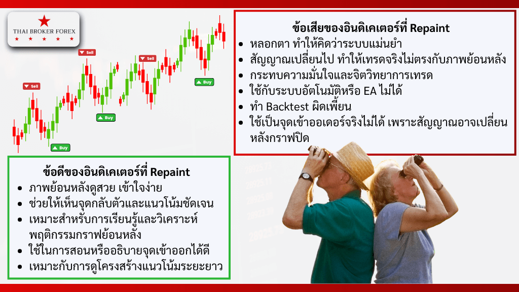 - ตัวอย่างที่เจอบ่อย เช่น อินดิเคเตอร์ลูกศรบอกจุดเข้าออเดอร์ ที่ตอนย้อนดูชี้เป๊ะตรงจุดกลับตัว แต่เวลาเทรดจริง ลูกศรโผล่แล้วหายไป
