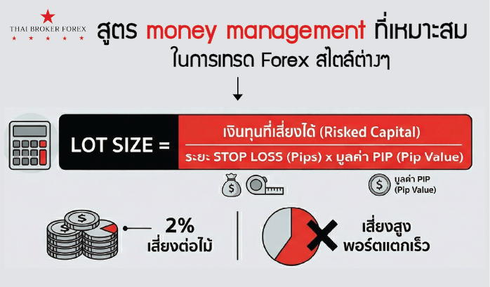 สูตร: เงินที่ยอมเสียได้ (USD) ÷ (ระยะ Stop Loss (Pips) × มูลค่าของ 1 Pip) = Lot Size ที่ต้องใช้