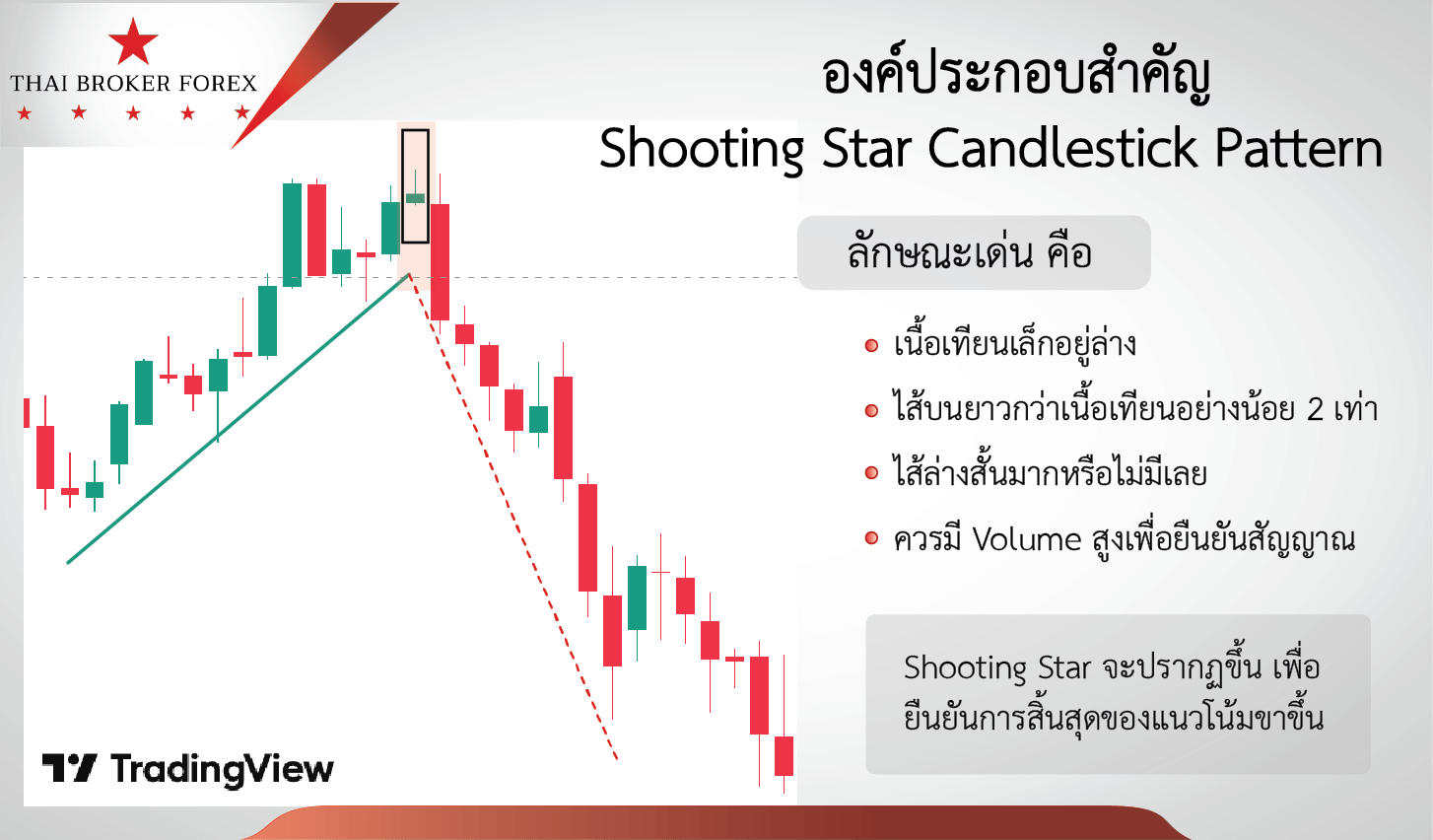 - ดังนั้น Shooting Star จะปรากฏขึ้นเพื่อ ยืนยันการสิ้นสุดของแนวโน้มขาขึ้น โดยมีลักษณะการพุ่งขึ้นชั่วคราวก่อนที่แรงขายจะกลับมาควบคุมตลาดและผลักดันราคาลงไปอีกครั้ง การเกิดรูปแบบนี้มักมาพร้อมกับปริมาณการซื้อขาย (Volume) ที่สูง ซึ่งช่วยยืนยันความน่าเชื่อถือ