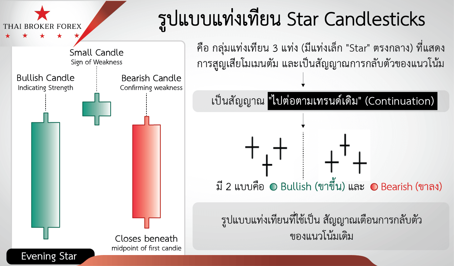 รูปแบบแท่งเทียน Star Candlesticks คือ สัญญาณ “กลับตัว” (Reversal) แบบ 3 แท่งเทียน ที่บ่งบอกว่าแนวโน้มเดิมกำลัง “หมดแรง” ของแนวโน้มปัจจุบัน ซึ่งส่งสัญญาณว่าโมเมนตัมของทิศทางราคากำลังจะหมดแรง และมีโอกาสสูงที่จะเกิดการ “กลับตัว” (Reversal) ของแนวโน้มในไม่ช้า