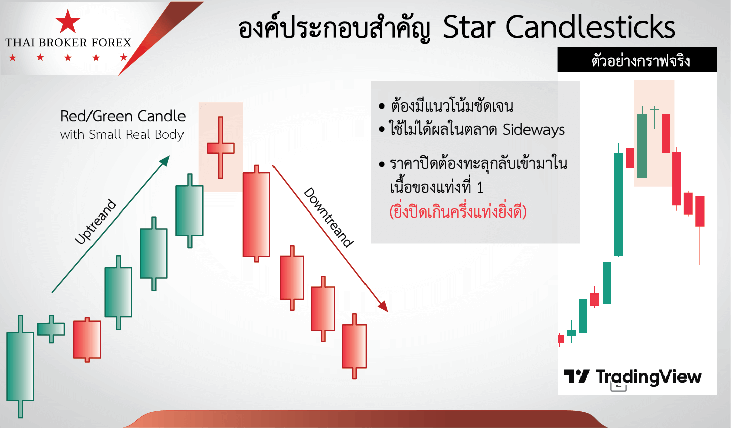 - แท่งที่ 2 (The Star): เป็นแท่ง Body สั้นๆ (สีใดก็ได้) ที่เปิด Gap สูงกว่า ราคาปิดของแท่งแรก สะท้อนความลังเล