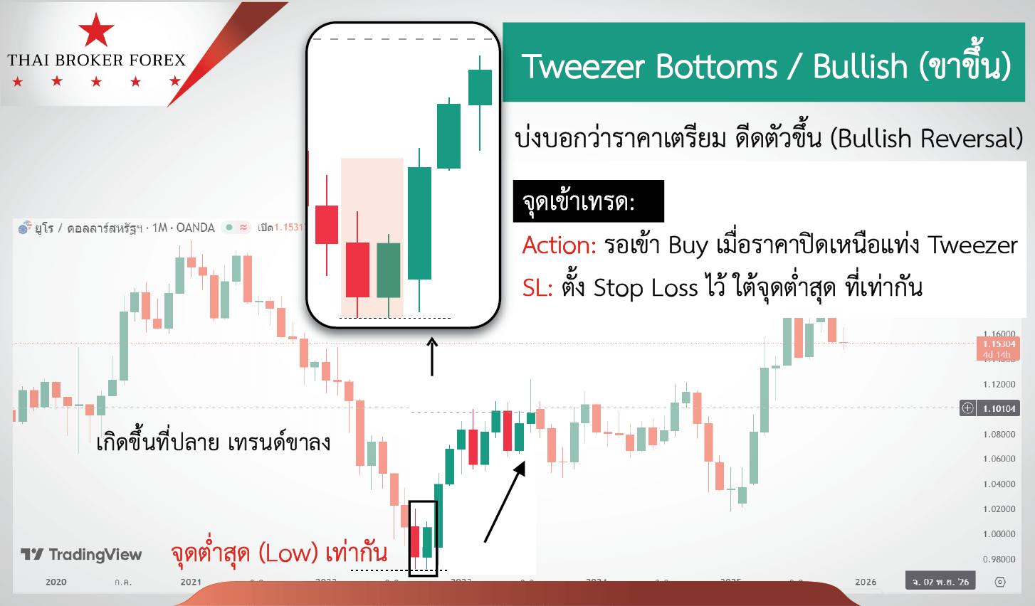 - Stop Loss: ตั้งไว้ที่ใต้ จุดต่ำสุดที่เท่ากัน ของทั้งสองแท่ง