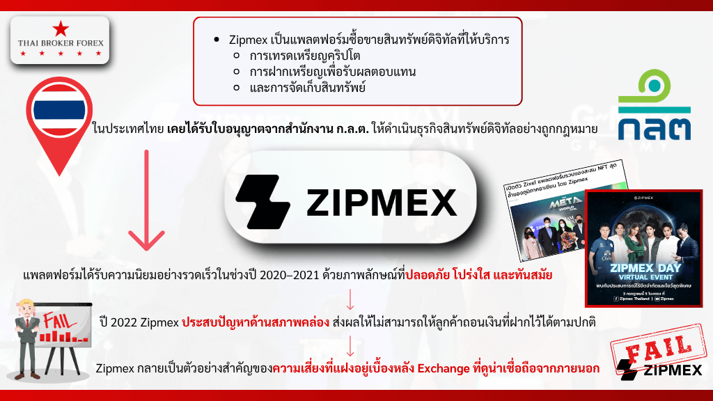 • อย่างไรก็ตาม ปี 2022 Zipmex ประสบปัญหาด้านสภาพคล่อง ส่งผลให้ไม่สามารถให้ลูกค้าถอนเงินที่ฝากไว้ได้ตามปกติ