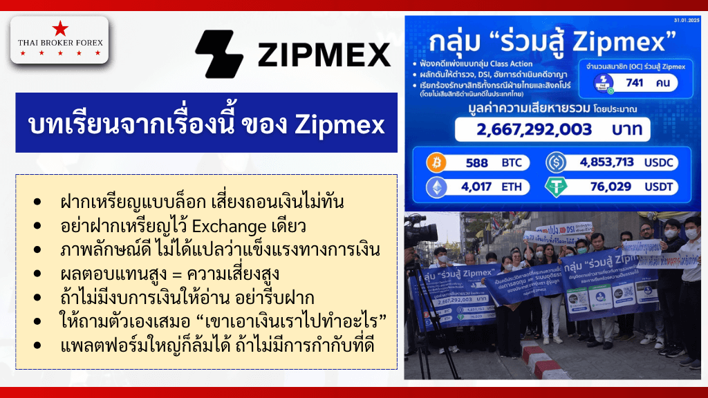 ภาพเผยถึงบทเรียนจากเรื่องนี้ และ ภาพด้านขวาคือกลุ่มที่ร่วมสู้ Zipmex โดยมีมูลค่าความเสียหายรวมประมาณ 2 พันล้านบาท