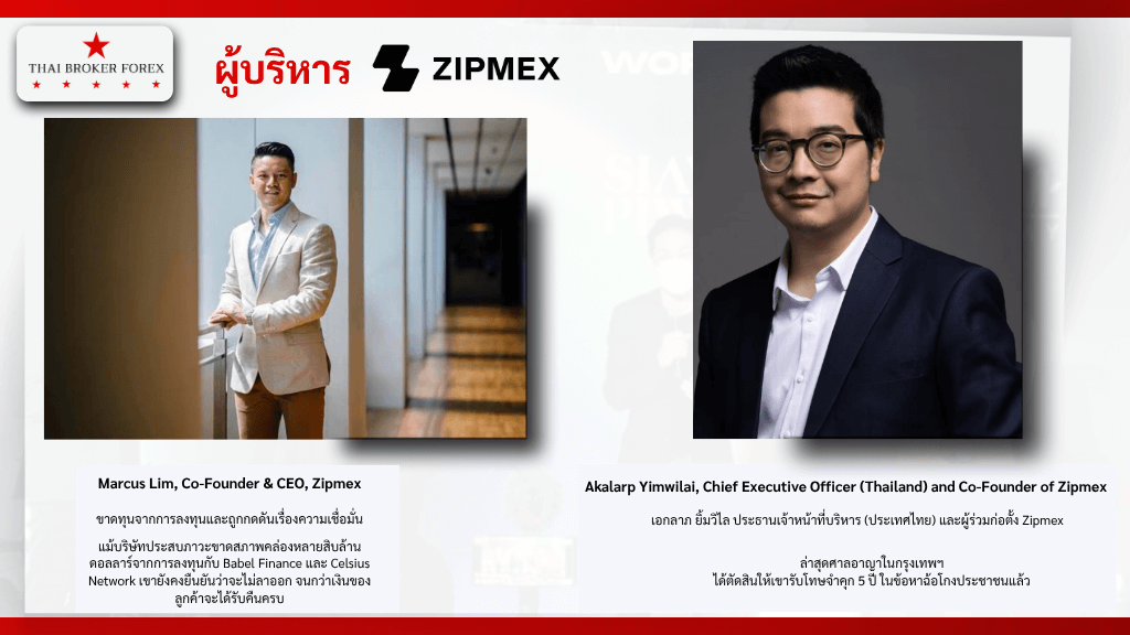 ภาพเผยถึงผู้บริหารใหญ่ของ Zipmex และ เอกลาภ ยิ้มวิไล ประธานของ ผู้ก่อตั้ง Zipmex ในประเทศไทย ซึ่งรายแรก กำลังชดใช้เงินให้กับลูกค้า ส่วนอีกรายถูกจำคุก 5 ปี ในข้อหาฉ้อโกงประชาชน